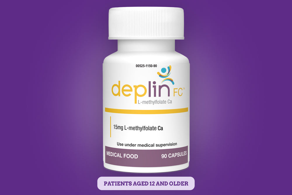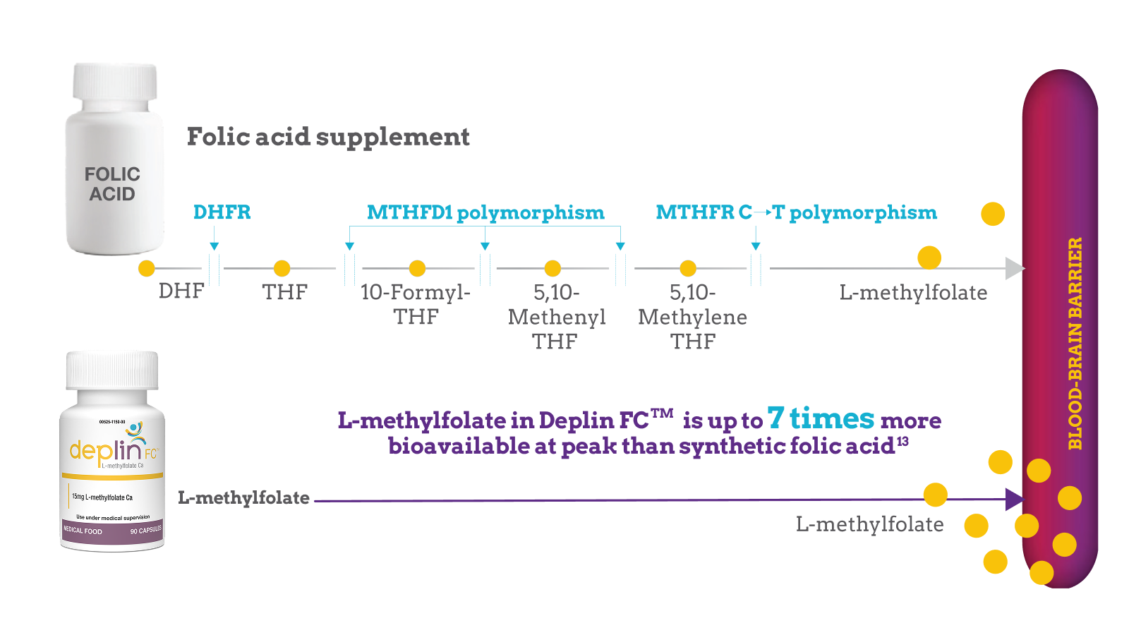 Deplin FC™ contains L-methylfolate, a biologically active form of folate that can cross the blood-brain barrier in one step.5 It’s up to 7 times more bioavailable at peak than synthetic folic acid.13 L-methylfolate is recommended to be added to a primary treatment for mild to moderate major depressive disorder.16, 17